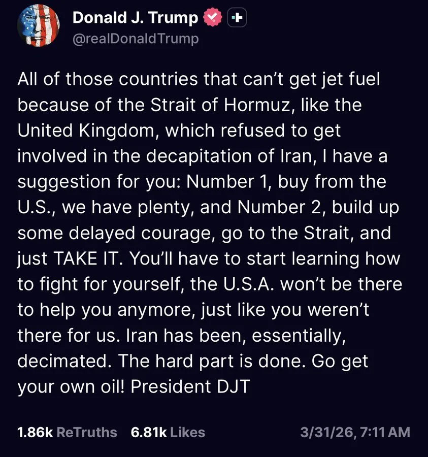 The Kobeissi Letter:PRESIDENT TRUMP: “All of those countries that can’t get jet fuel because of the Strait of Hormuz, like the United Kingdom, which refused to get involved in the decapitation of Iran, I have a suggestion for you: Number 1, buy from the U.S., we have plenty, and Number 2, build up some delayed courage, go to the Strait, and just TAKE IT. You’ll have to start learning how to fight for yourself, the U.S.A. won’t be there to help you anymore, just like you weren’t there for us. Iran has been, essentially, decimated. The hard part is done. Go get your own oil!”