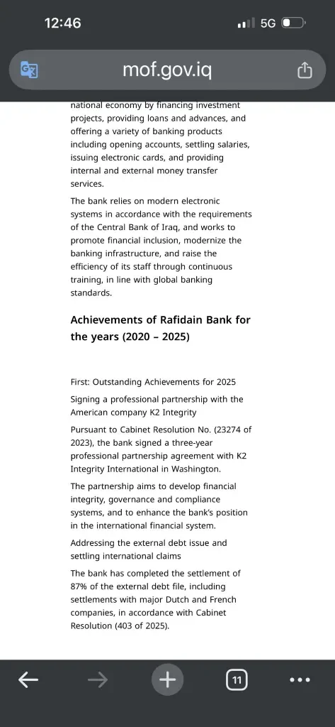The bank is operating under Central Bank of Iraq requirements, has adopted modern electronic banking systems, and is aligned with global banking standards. In 2025, Rafidain entered a three year professional partnership with the US firm K2 Integrity to strengthen governance, compliance, and financial integrity. The bank has also completed settlement of 87 percent of its external debt, including international claims.