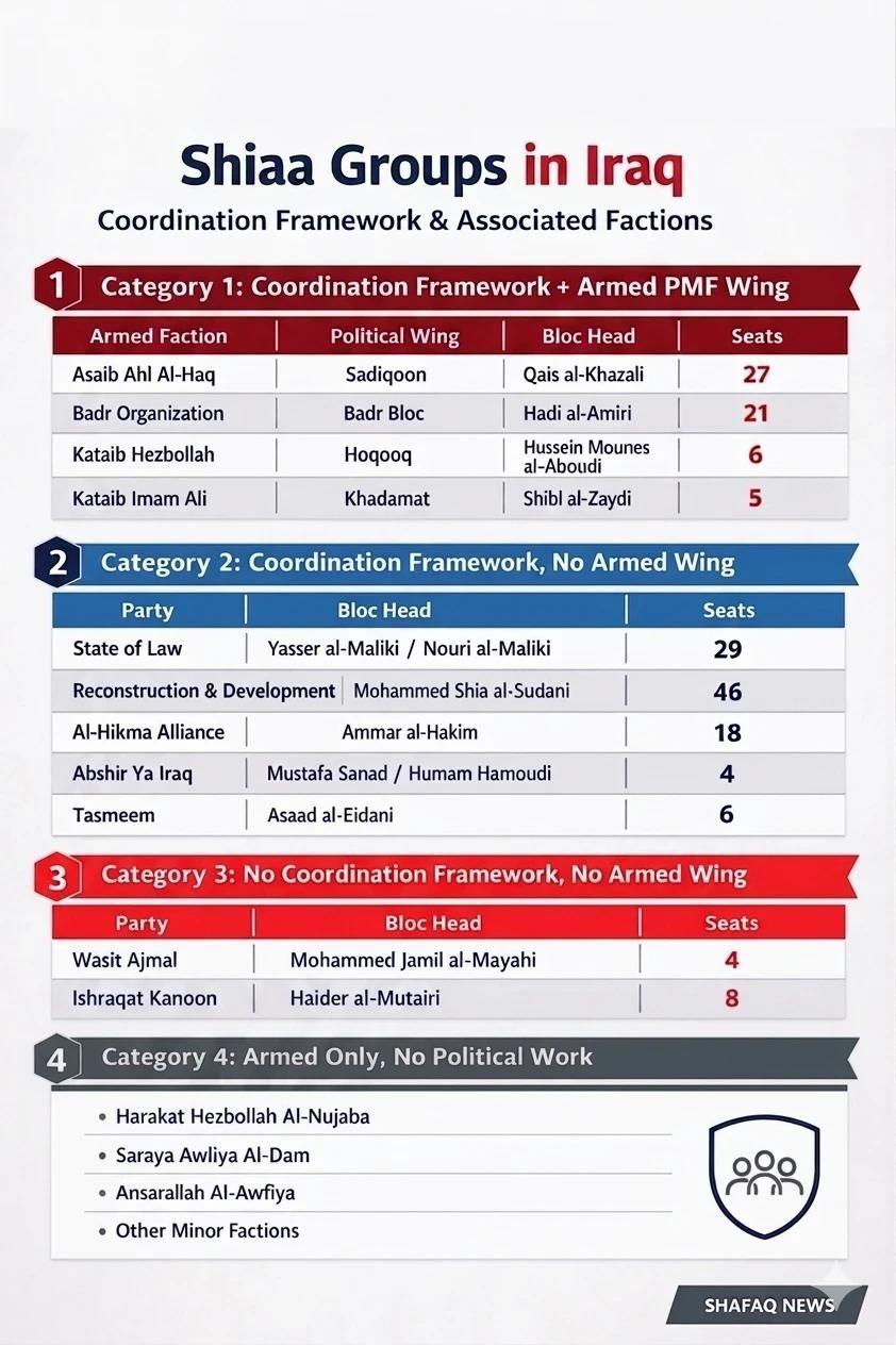 The second category, CF members without armed wings, holds the Framework's numerical majority at 103 seats. Caretaker Prime Minister Mohammed Shia al-Sudani's Reconstruction and Development coalition, the election's largest single winner with 46 seats, anchors this group.