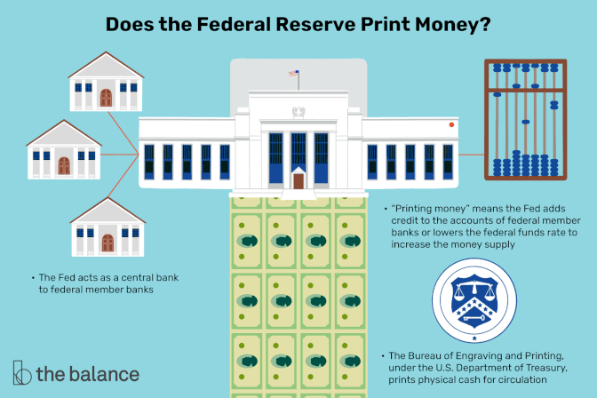 does the federal reserve print money? The Fed acts as a central bank to federal member banks; “Printing money” means the Fed adds credit to the accounts of federal member banks or lowers the federal funds rate to increase the money supply; The Bureau of Engraving and Printing, under the U.S. Department of Treasury, prints physical cash for circulation