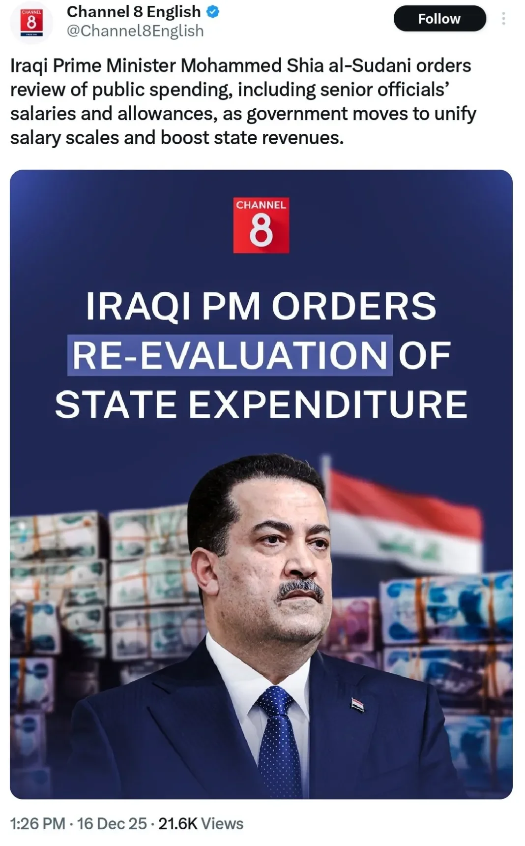 Iraq’s PM just ordered a re-evaluation of state spending — senior salaries, allowances, and unified pay scales — while officials admit oil alone can’t cover salaries and expenses anymore.