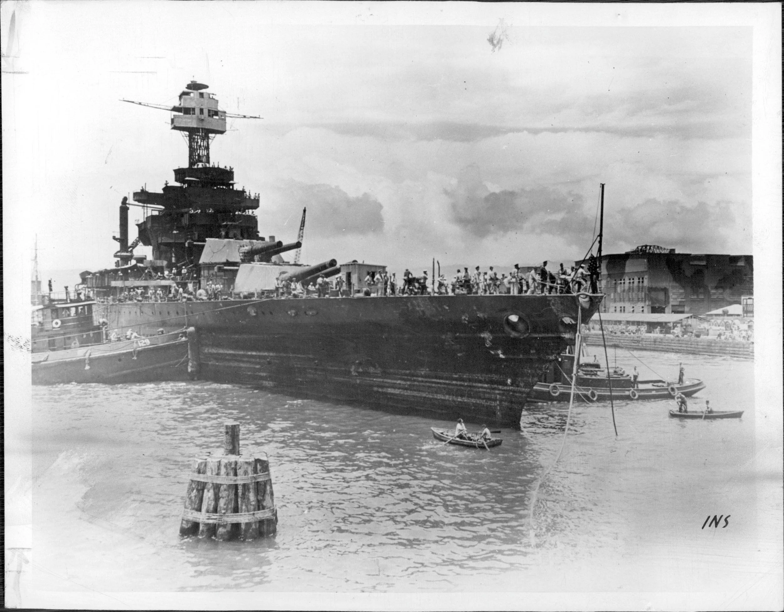 The USS West Virginia gets towed to drydock to start repairs in 1942.